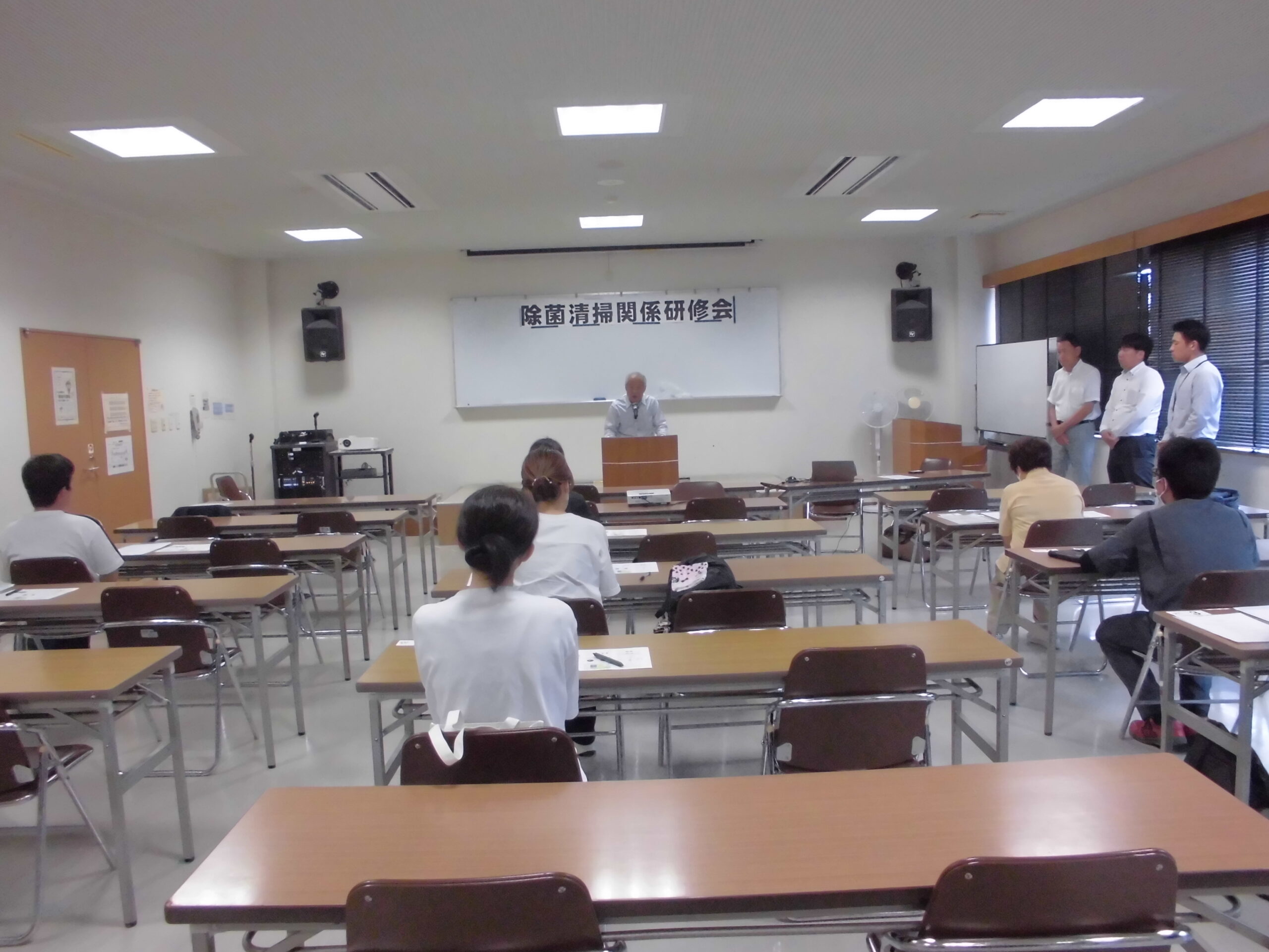 除菌清掃関係研修会(6社・8名参加)を、郡山市労働福祉会館において開催しました。八巻会長のあいさつの後、当協会の賛助会員であるシーバイエス株式会社・新部紀夫様から「細菌・ウイルスの基礎知識」「感染予防の除菌・除ウイルス」について、ご講義いただきました。