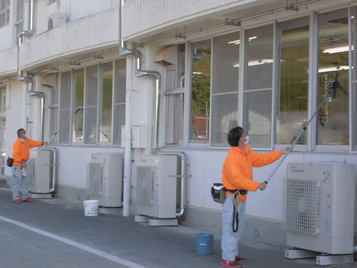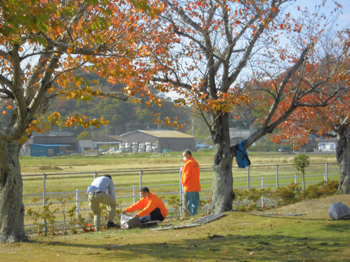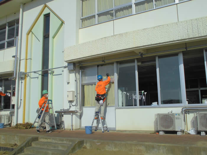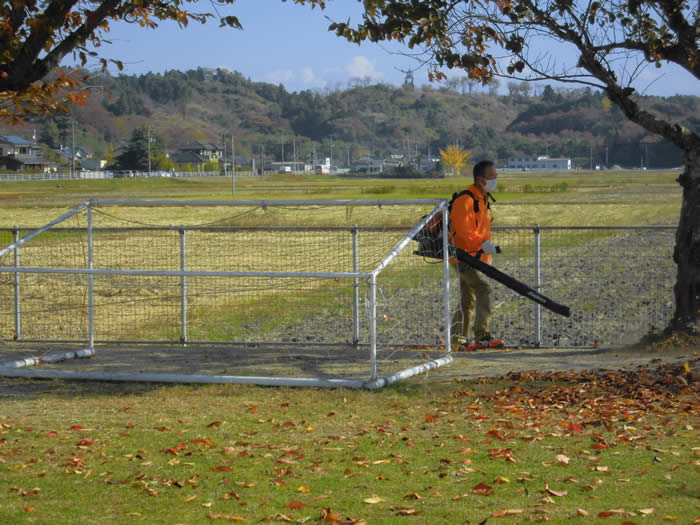 いわき支援学校(いわき市)において、19社34名の参加を得て、清掃奉仕活動を行いました。校庭の除草作業、落ち葉拾い、校舎1階外側ガラス拭き清掃を、皆で声を掛け合いながら行い、時間内でキレイに清掃を終えることが出来ました。
