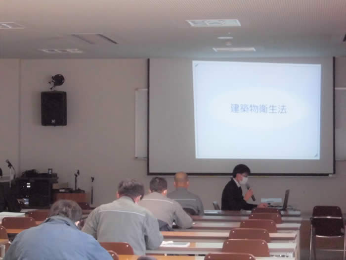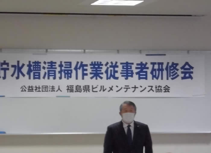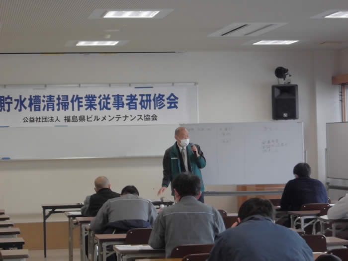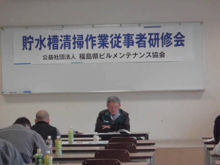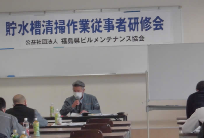 佐藤会長の挨拶の後、福島県食品生活衛生課の川合副主査から「建築物衛生法を中心とした関係法令」について、協会講師の太田幹(太平ビルサービス(株)郡山支店)、八巻照男(友愛プロサービス(株))、伊藤力恵(東日本ユニットサービス(株))の各氏から、「水と健康」「貯水槽の消毒方法」「作業の安全と衛生」「貯水槽の清掃方法」「貯水槽の塗装方法」「給水設備と機器」について講義が行われました。