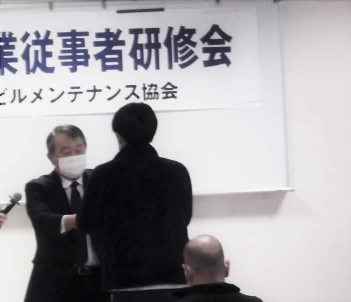 講義の終了後、佐藤会長から受講生を代表して、(株)アサヒビルメンテナンスの天野雄介さんに修了証書が授与されました。