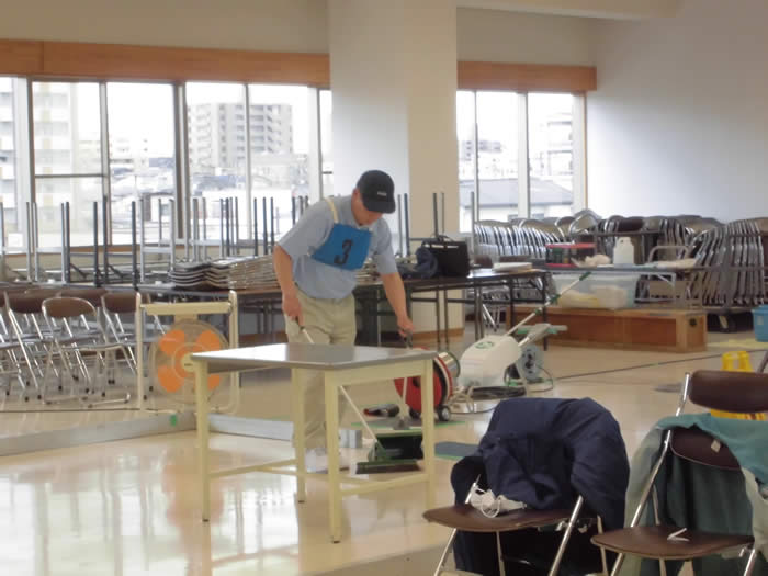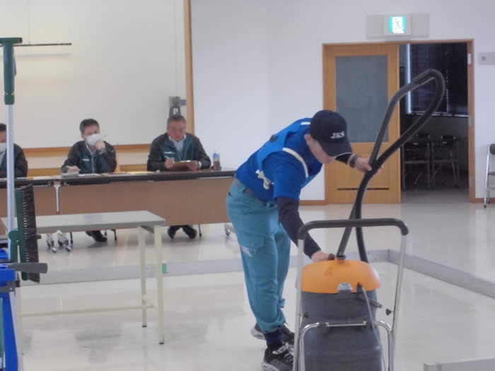 今年度は、3社から3名の選手にご参加いただきました。佐藤会長のあいさつの後、審査員より競技説明を行い、床の表面洗浄の実技を競いました。各選手ともに、真剣な表情で練習の成果を発揮していました。