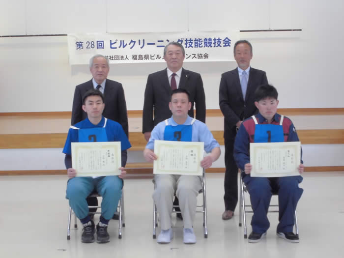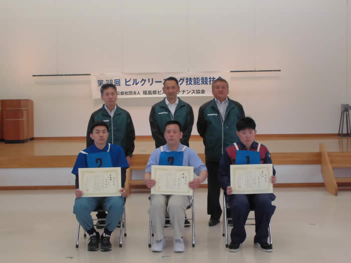 競技の結果、優勝は菅野真道((株)アサヒビルメンテナンス)、準優勝は今野輔(常光サービス(株))、第3位は渡邉海斗((株)ローズ・ビルサービス)の各選手でした。なお、菅野選手は全国大会出場経験があるため、今野輔選手が6月7日に仙台市で開催される「全国ビルクリーニング技能競技会東北地区予選会」に福島県代表として出場します。