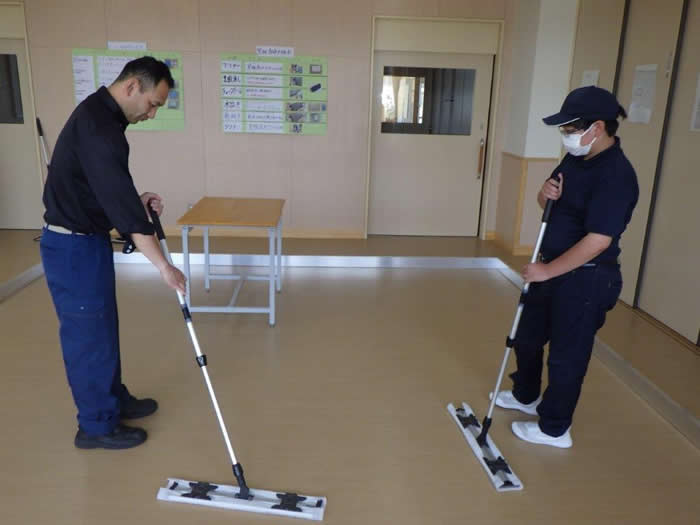 高等部の生徒さんへ清掃道具の扱い方と清掃作業について技術指導を行いました。