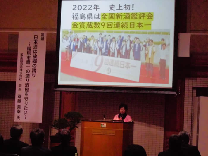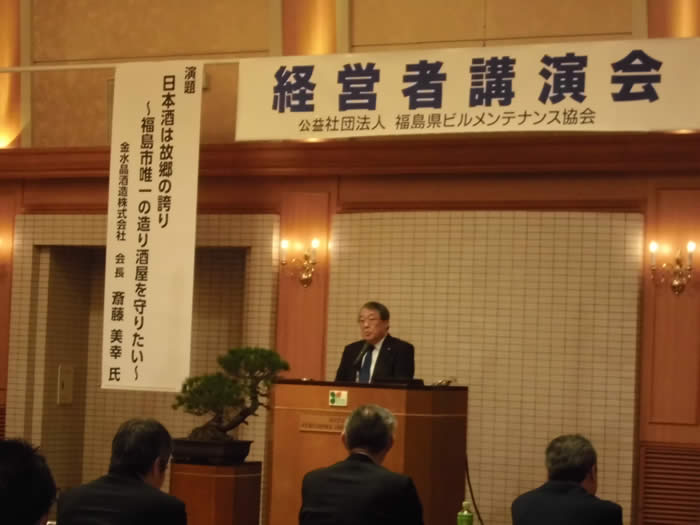 ホテル福島グリーンパレスにおいて、24社37名に参加いただき、新春講演会を開催しました。佐藤会長の新年のあいさつに続き、講師 金水晶酒造株式会社 会長斎藤美幸氏により「日本酒は故郷の誇り~福島市唯一の造り酒屋を守りたい~」と題し、具体的事例を交えた熱い新春にふさわしい講演を皆熱心に聴講致しました。
