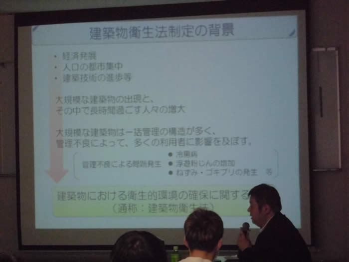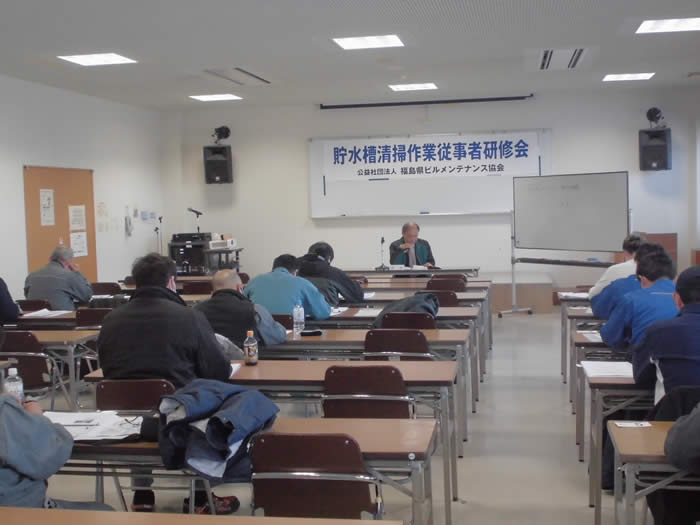 佐藤会長の挨拶の後、福島県食品生活衛生課の石森主査から「建築物衛生法を中心とした関係法令」について、協会講師の太田幹(太平ビルサービス(株)郡山支店)、八巻照男(友愛プロサービス(株))、伊藤力恵(東日本ユニットサービス(株))の各氏から、「水と健康」「貯水槽の消毒方法」「作業の安全と衛生」「貯水槽の清掃方法」「貯水槽の塗装方法」「給水設備と機器」について講義が行われました。